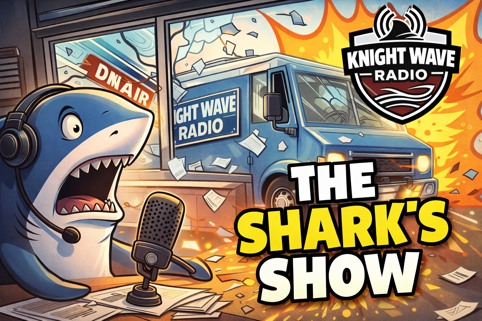 The Shark starts broadcasting “The Shark Show” without permission—already live, already confident, already chaos. As Jason tries to shut it down, the Knight Wave Radio–wrapped food truck sponsor rolls past the window and then lightly bumps the radio station like it’s part of the plan. Call lights go wild, everyone panics, and Jesus stays calm with one simple line: “Maybe