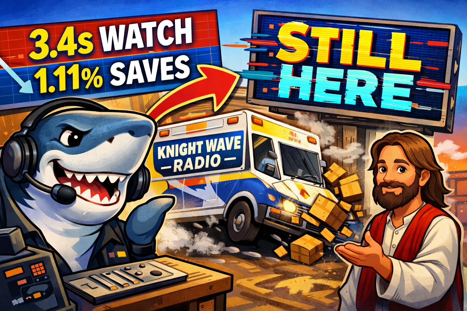 Knight Wave Radio delivers another faith-friendly comedy short as the crew discovers their daily schedule is nothing but CHAOS. When Grandpa Knight calls it “honest,” the talking shark demands to know what time he gets to yell. Just when the chaos peaks, a calm, blue-collar Jesus adds one simple word: PAUSE.